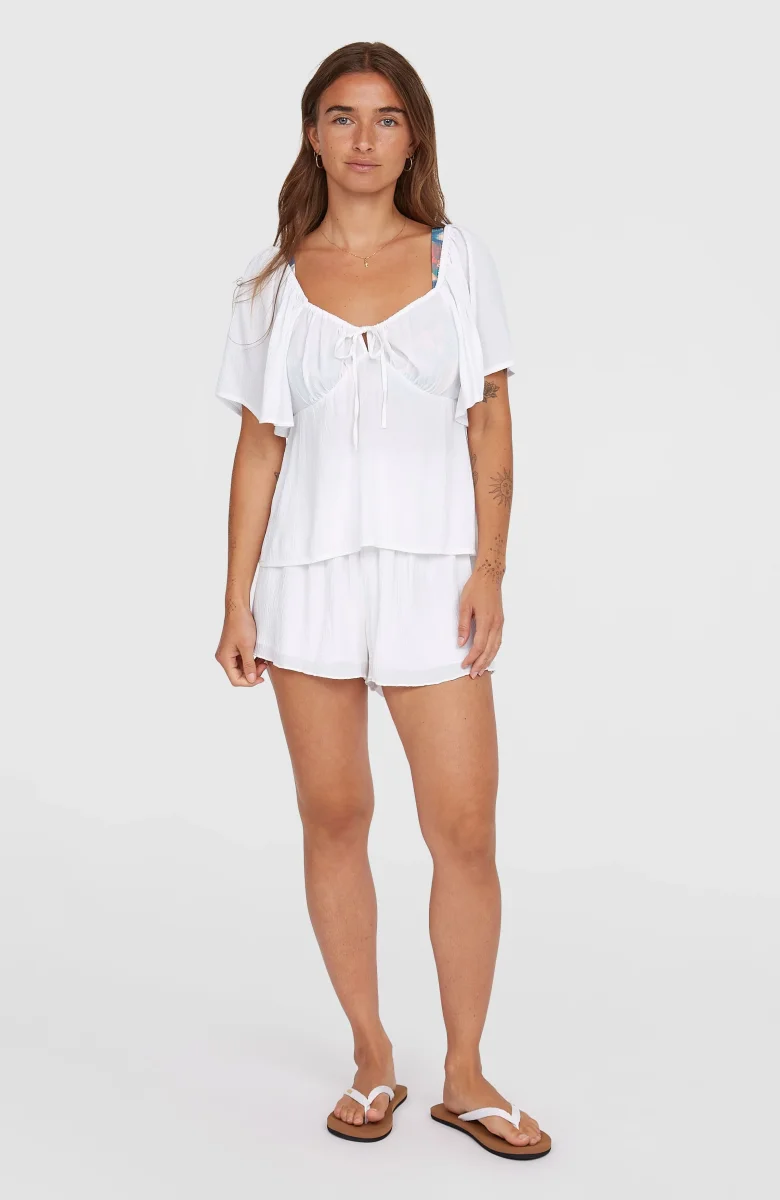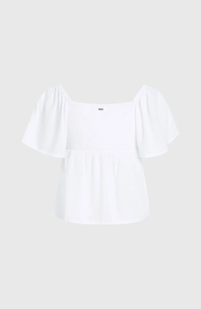 Le haut en tissu Huges présente une encolure et des manches volantes, parfaites pour les journées ensoleillées. Modèle à la coupe classique, il est aussi doté d’un lien en tissu réglable au centre de l’encolure en V et d’un élastique intégré aux épaules et autour de l’encolure. Son dos élastique encastré avec des fronces vient parfaire son look rappelant la plage. Entièrement confectionné en viscose Livaeco.